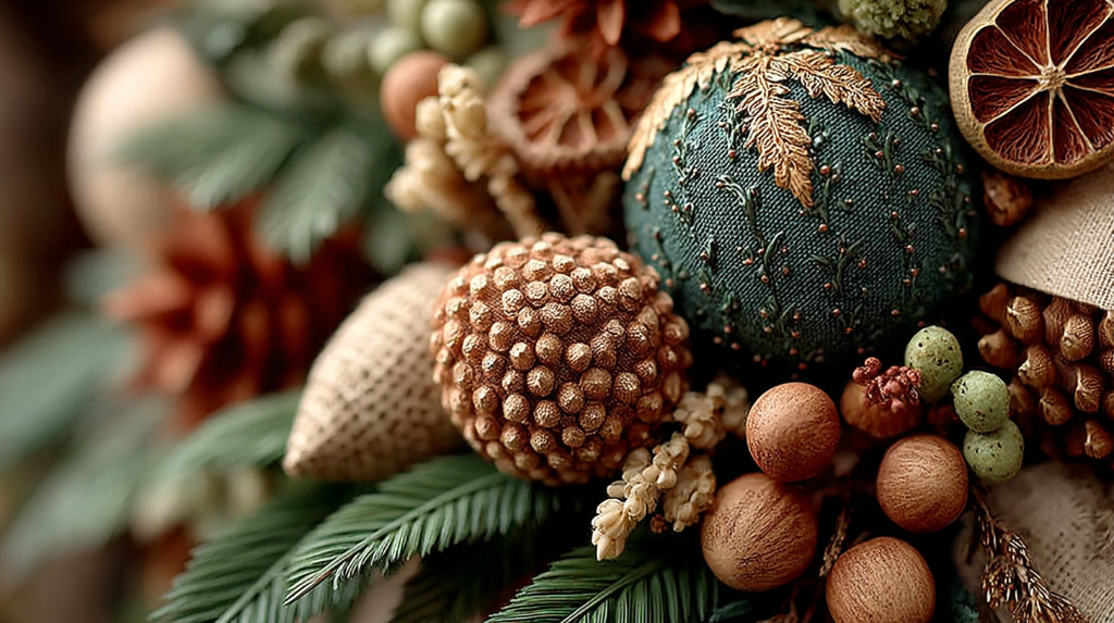 Экологичный декор с использованием натуральных шишек, орехов и золотых акцентов — идеальное воплощение тренда на природные материалы.