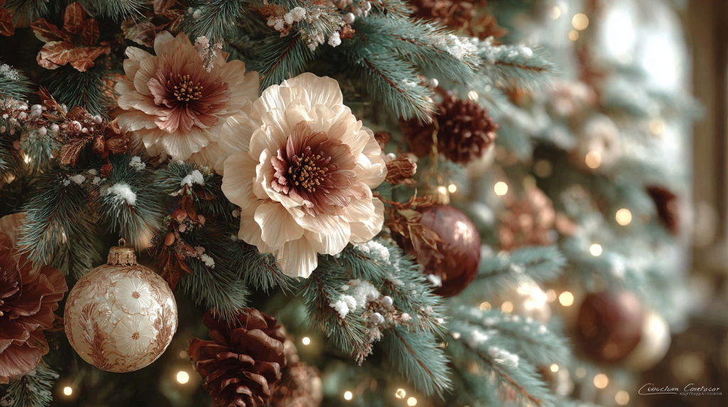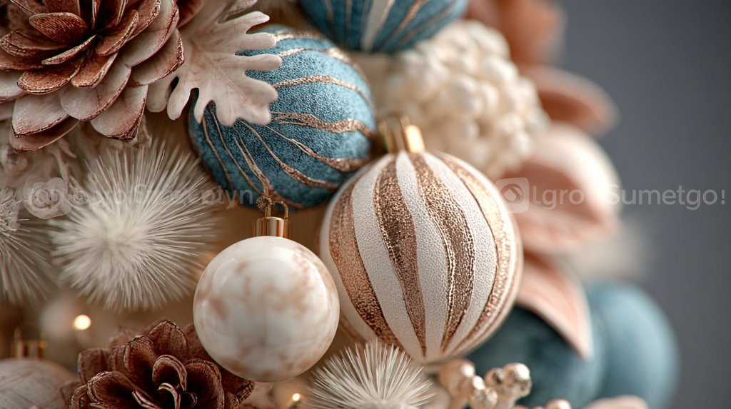 Помимо бежево-коричневой гаммы, в тренде остаются классические монохромные варианты: белая или зелёная ёлка с серебряными акцентами, синяя палитра от нежно-голубого до глубокого сапфирового, розово-золотое сочетание для создания романтичной атмосферы.