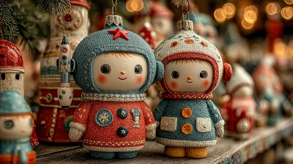 Использование советских стеклянных игрушек: космонавты, ракеты, шишки, зверушки на прищепках