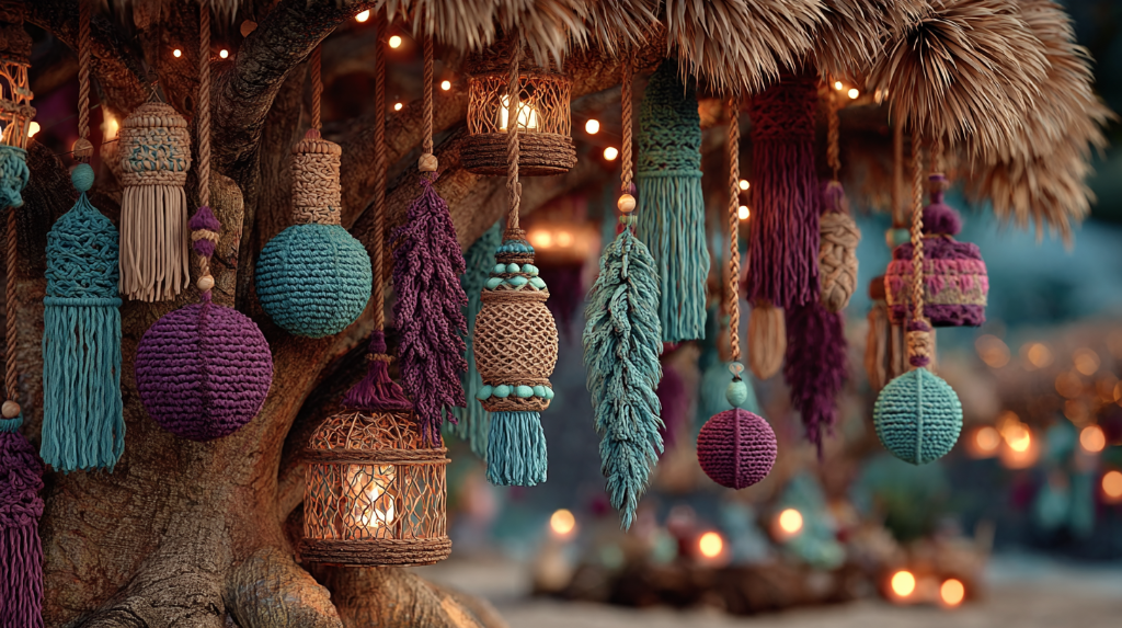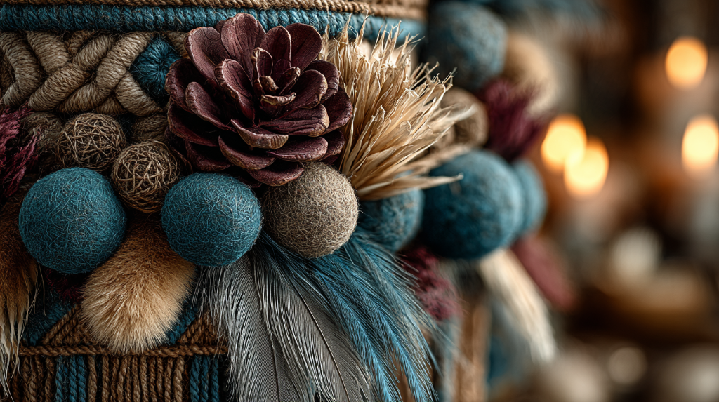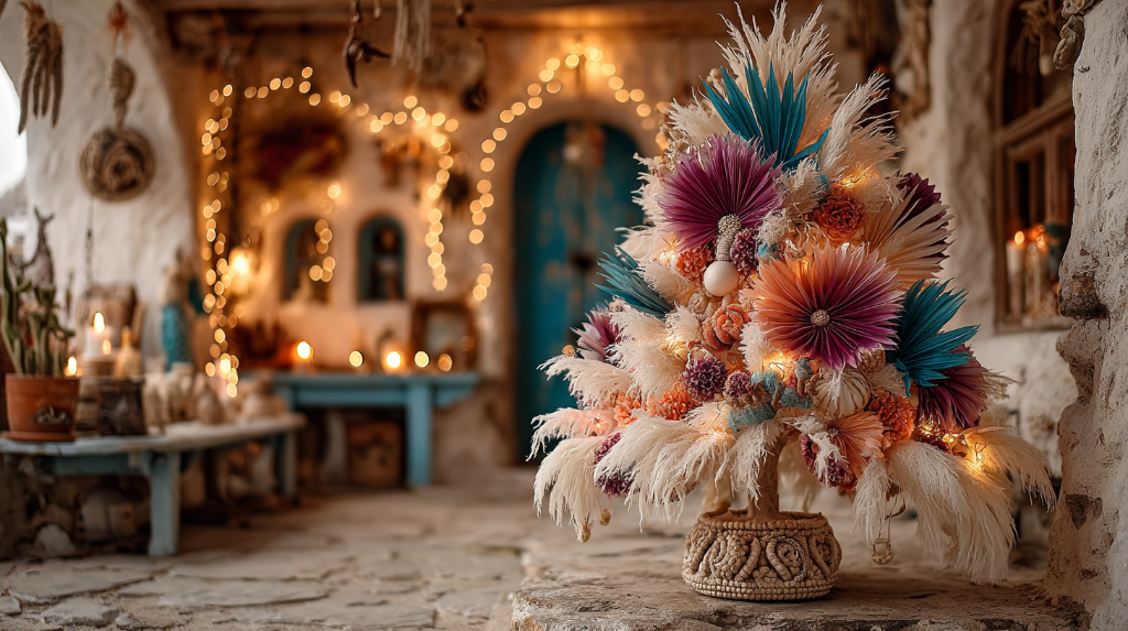 Бохо-ёлка не терпит строгих правил. Комбинируйте разные материалы и цвета, добавляйте hand-made элементы, не бойтесь ярких акцентов. Цветовая палитра может быть самой разнообразной: от природных землистых тонов до насыщенных бирюзовых и фиолетовых оттенков. Основание ёлки поместите в красивую плетёную корзину или оберните текстилем. Компания «Ёлочки в Дом» предлагает уникальные декоративные элементы, которые идеально впишутся в бохо-композицию.